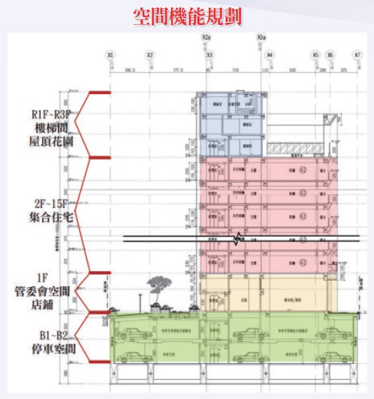 本案採取前後雙動線,一樓大廳可前後進出,庭院圍繞著公設,空間使用上一樓為店舖+大廳,二至十五樓住宅使用,地下一、二層停車空間,機能單純可提供住戶更放鬆的生活空間。