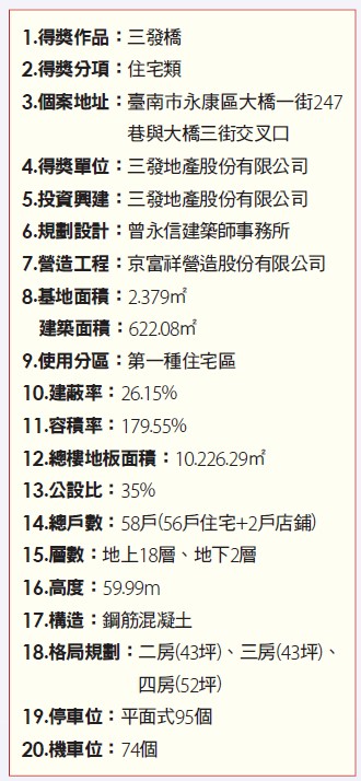 (二)本案在建築、室內、景觀上做三位一體的規劃,基地開發之初除建築規劃外也期待能帶給環境正向的幫助,透過認養前方綠地串聯前後街廓,景觀納入夜間照明的考量,將燈光作為主要設計元素,改善夜間通行的安全,建築室裝呼應府城意象,將路上常見的老屋材料磨石子、圓弧等元素用在室裝上,用現代的風格呈現,磨石子特有厚實、溫潤的感覺與家的意象前後呼應。
