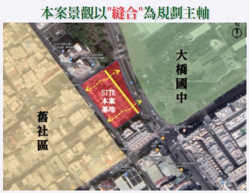 1.基地北側為大橋國中,南側是舊社區前後不連通,通行上極為不便。