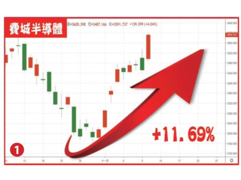 美國四大指數十一月初至11/10表現,道瓊指數上漲1230點漲幅3.72%、NASDAQ上漲946點漲幅7.37%、S&P500上漲221點漲幅5.28%、費城半導體上漲375點漲幅11.69%(詳圖一),造就科技類股漲勢驚人主因就是公債殖利率自高點滑落(以十年期公債殖利率來說由5.02%高點下跌至4.62%)。同期台股加權指數上漲838點漲幅5.24%(詳圖二),櫃買指數上漲8.65點漲幅僅4.13%,顯示本波行情係由大型權值股發動上攻,投資人可期待下波中小型股落後補漲的表現!