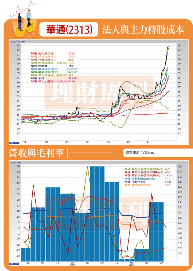 目前因股價基期相對低檔,近日量能增溫,三大法人買超布局動作明顯,股價隨量增價溫和上漲,應是為明年高成長股納入成分股悄悄布局。理周投研部指出,市場均以華通明年因手機與PC/NB消費性電子需求回穩,加下衛星板的出貨增加,明年EPS有機會挑戰5.8元水準,後年更有泰國廠產能線加入營運,屆時有機會加入AI伺服器供應鏈,第二季前法人僅給予10倍本益比計。理周投研部則認為,以第三季財報表現應提高本益比至15倍,近日量能均排在前名,顯然市場以低期股看待,逐步增溫攻漲,若以明年EPS、本益比15倍計,尚有隱藏漲幅可期待。