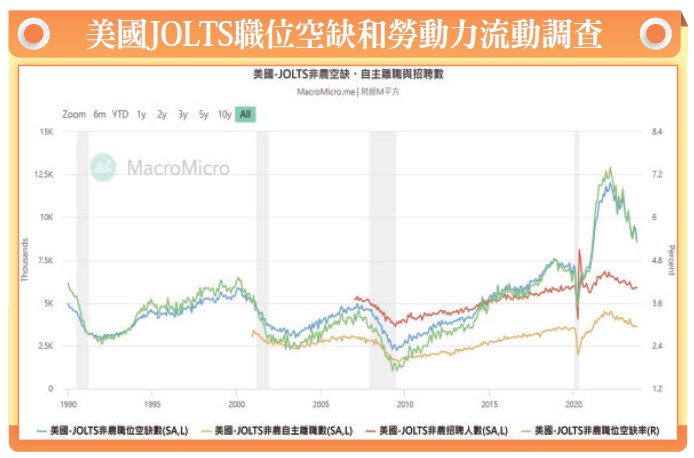 美國勞工部12月5日公布的職位空缺和勞動力流動調查(JOLTS)顯示,美國十月職位空缺由九月的935萬個跌到873.3萬個,少於預期930萬個,是2021年三月以來最少,這是美國經濟處在高利率仍然保有軟著陸機會,但勞動市場正在降溫的跡象,不過,儘管十月職位空缺大減,仍然處於歷史高點,已連續三十二個月超過800萬個,這是2021年前未曾見過的情況。