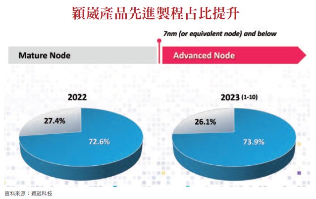 穎崴產品在「先進製程」的營收占比,從2022年72.6%增加到2023年73.9%。