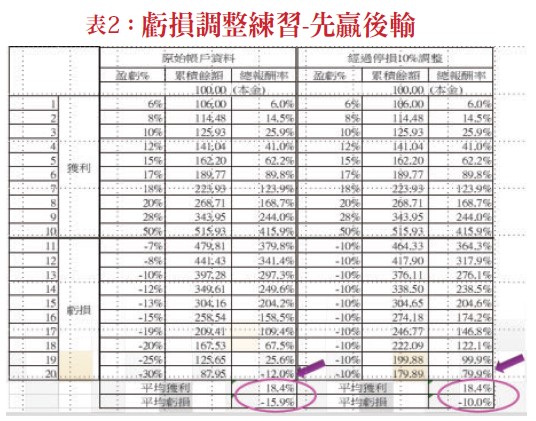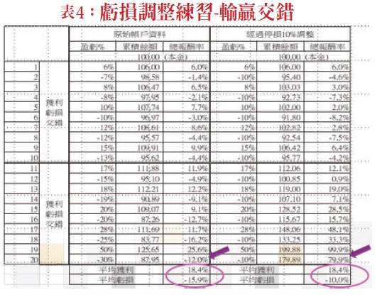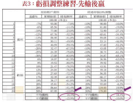有時候我們會有很長一陣子交易順手,然後碰上相當嚴重的連續虧損。這時我們會覺得迅速認賠似乎很有道理,但實際運用並不簡單。由表二、表三和表四我們可以模擬虧損調整練習,我們把停損一律都限制為10%,可以看看限制下檔損失對於原始本金為100萬元,二十筆交易總績效會產生什麼影響。限制虧損之後,雖然有些硬拗的部位因而轉敗為勝的成功交易消失了,但這方面的不利影響遠低於迅速認賠的有利影響。