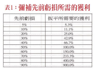 我們由表一可以發現,停損與你資金的有效調度至關重大。此處欲強調的重點是:絕對不要發生足以造成帳戶重大傷害的虧損,虧損越大,越難復原。帳戶若發生嚴重虧損,就等於喪失購買力;當我們終於發掘大贏家時,帳戶規模可能已經大幅縮水,要扳平將非常費力。