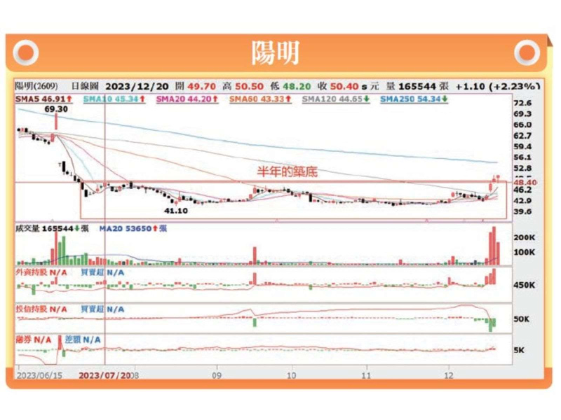 以十二月份的漲幅來看,長榮的32.14%漲幅明顯超過陽明的20%,這個換股操作算是精準。但筆者注意到的是,陽明沒有被投信的71709張賣超給壓垮,反而上漲到50.4元,更重要的是,12月19日的275151張成交量,已經達到7月3日除息前一天的277851張成交量,不排除陽明這波的走勢有機會跟隨長榮的上漲挑戰除息參考價69.3元,也就是說,上方潛在空間達37.5%。