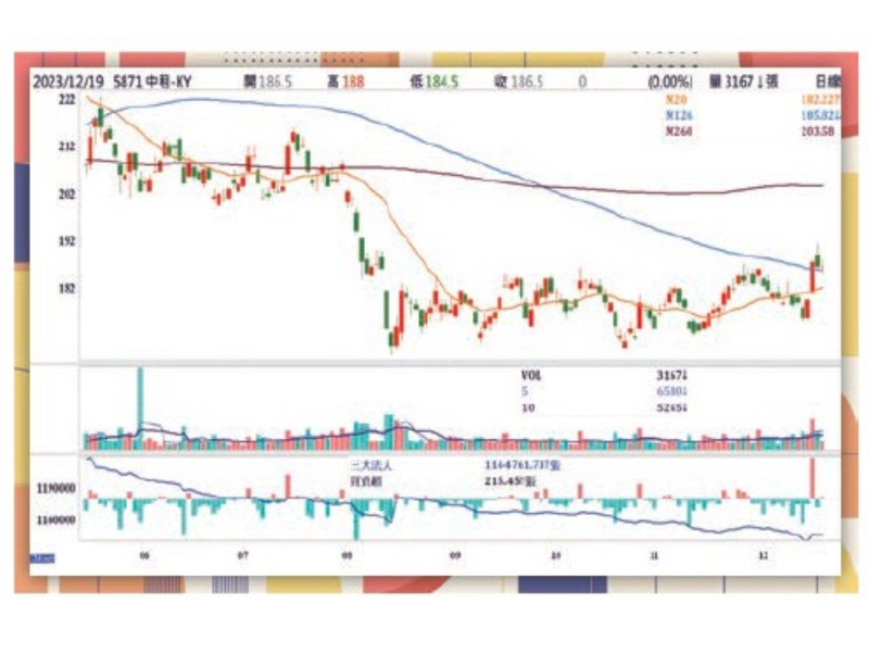 中租-KY股價在今年一月份曾達243.5元,之後就逐步震盪走低回測170元五年線關卡,加權指數今年漲幅仍有24.86%,中租-KY股價卻年減14.06%,已經嚴重超跌,以12/19收盤價186.5元計算本益比只有十二倍,具長線投資價值。最近三個月股價都在174~187元區間震盪打底,未來如果突破187元底部頸線關卡,就有機會走出一波補漲行情。