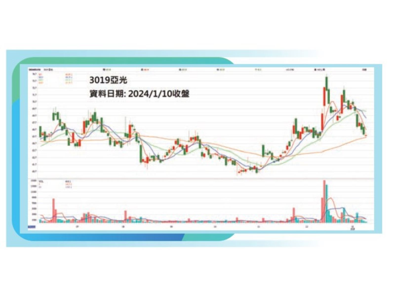 亞光(3019),產品包括:光學鏡片、光學鏡頭、光通訊、車用光電等。2023年一至十二月累計營收為178.24億元,年減6.56%。十二月營收為15.67億元,年增7.74%,前三季毛利率約18.1%,略低於2022年同期的19.3%,不過從單月營收來看,公司於十一月營收年月雙增。