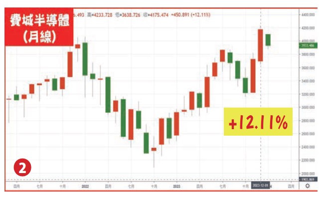 美國四大指數去年12月表現頗佳,道瓊指數上漲1738點漲幅4.84%、NASDAQ上漲785點漲幅5.52%、S&P500上漲202點漲幅4.42%、費城半導體上漲150點漲幅12.11%(詳圖二)。美元兌新台幣由本波高點32.495升值至2023/12/28最低30.64強力升值達5.7%,顯見國際熱錢持續湧進台灣,造就外資11~12月大買台股達4,201億,加權指數1月2日開紅盤再創今年新高17956點,選舉的不確定因素即將過去,元月及作夢行情即將發動,投資人更要把握近期震盪的好機會!