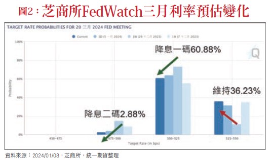 去年十二月,市場交易員認為三月降息機率高達近九成,這樣樂觀的預期在年後就開始修正(圖二),連帶美元指數開始強力反彈,亞洲貨幣全部倒地,債券市場殖利率走高,形成股匯債三殺情境,其中原因為何?後續又會如何影響股匯債市?筆者將在下文提供自身看法供理財周刊讀者參考。