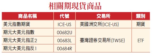 美元指數是相當廣為人知的商品,在集中市場也有發行ETF,包含原型的期元大美元指數(00682U)、正向二倍的期元大美元指正2(00683L)以及反向的期元大美元指反1(00684R)。若市場對於聯準會的降息預期增加,美元指數就容易形成較為弱勢的格局;相對的若市場的降息預期下降,代表將維持更高的利率更長的時間,那麼美元指數則容易走出反彈轉強格局。