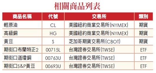 若想把握此次升息循環結束後的原物料復甦行情,可參考標的如:輕原油期貨(CL)、高級銅期貨(HG)、黃豆期貨(S)。若偏好現貨商品,也可以選擇期街口布蘭特正2(00715L)、期街口道瓊銅(00763U)、期街口S&P黃豆(00693U)等ETF商品,提早逢低分批長線布局。