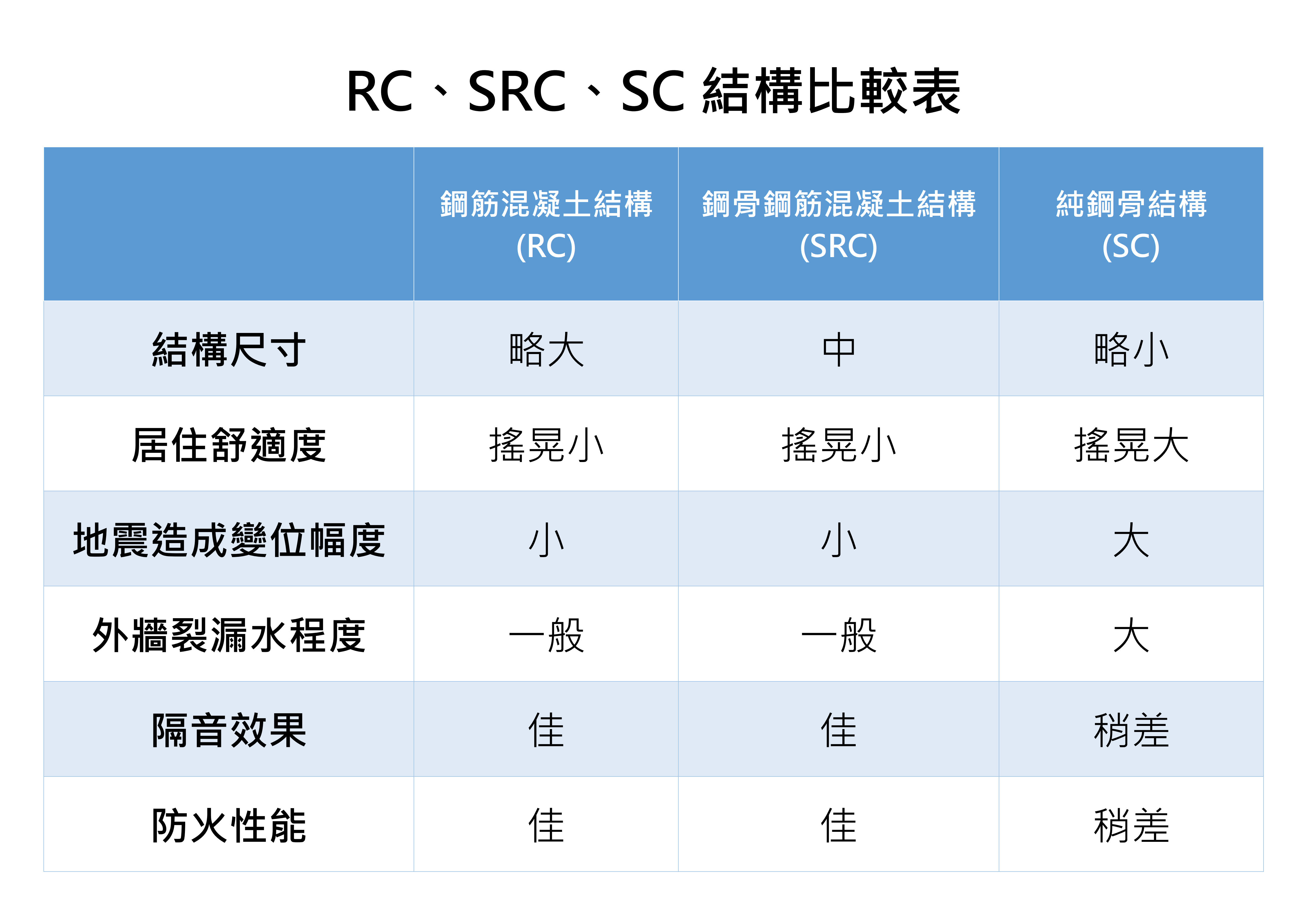 SRC比RC多了內部鋼骨的配置,有較強的韌性與抗拉能力,在樓層較高的建案中,與RC設計相較,可略為縮小柱的斷面尺寸,故在高層建築中會以SRC結構設計為主,主要是為減少柱所佔的空間面積。