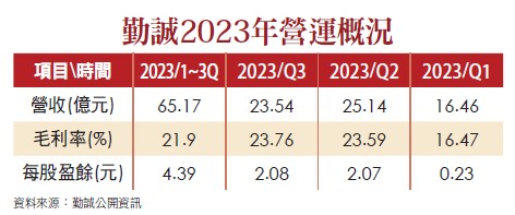 勤誠在產品組合優化、營收規模提升、精實生產效益持續顯現下,去年第四季毛利率較第三季再提高,第四季獲利估計是全年高點。去年毛利率呈逐季增長態勢,預期今年毛利率也再提升。