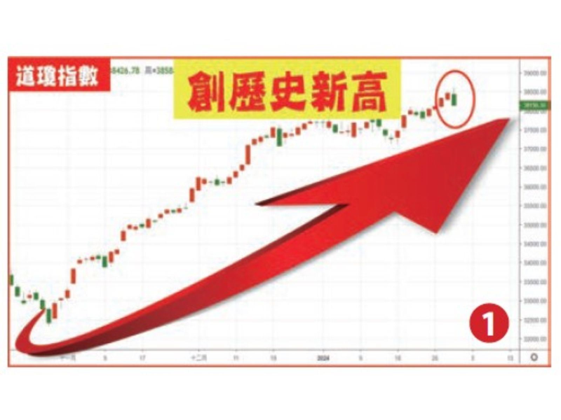 由於市場預期今年聯準會(Fed)將降息且適逢總統大選,強力貨幣釋出及政策作多,多頭行情從年初就開始,先來看一月美國四大指數表現:道瓊指數上漲460點(+1.22%)收38150點,再創歷史新高38588.86點(詳圖一);NASDAQ上漲1522點(+1.02%)收15164點,再創兩年新高15630.585點;S&P500上漲75點收4845.65點,再創歷史新高4931.09點;費城半導體上漲85點(+2.05%)收4260.92點,再創歷史新高4566.55點。
