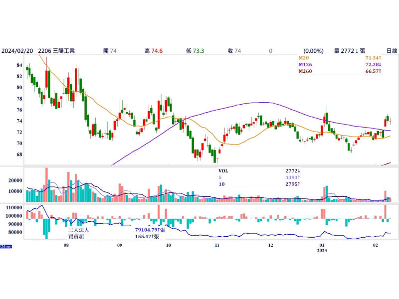 三陽股價配合營運淡旺季上半年都有多頭走勢,112年上半年從34.4元漲到六月99.3元,漲幅高達188%,111年上半年從26.1元漲到42.05元,漲幅也有61%。目前股價已長達六個月僅維持78~66元箱型打底,未來如果突破78元有機會配合營運旺季再度展現一波多頭行情。2/20收盤價74元本益比只有十倍,具投資價值,目前月線71.35元、半年線72.5元、年線66.5元,均線呈現多頭排列。