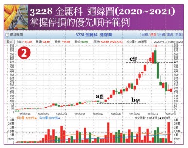 第三階段c點:保護帳面獲利─避免已經大幅獲利的帳面利益得而復失;設定追蹤型停利或回測停利點。
