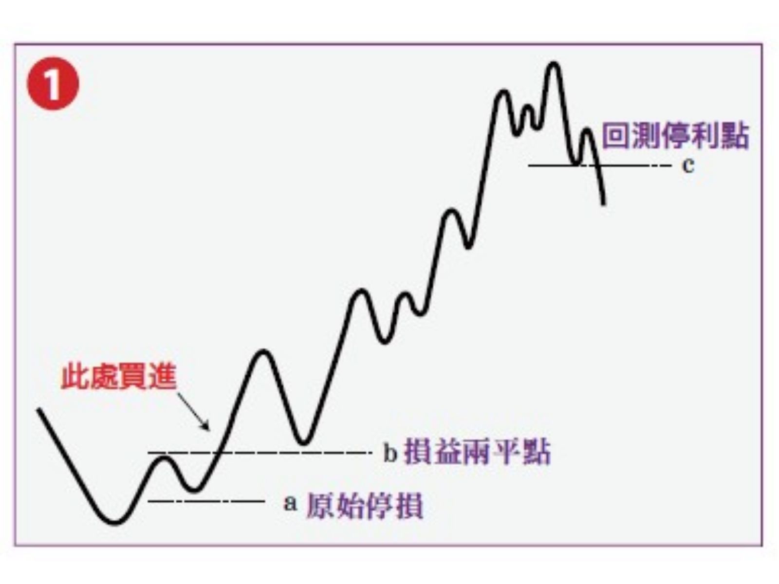 實際進場建立部位之前,要先決定萬一這筆交易失敗了自己準備在a點(起始停損點)認賠;如果交易順利,應儘快把起始停損點向上調整到損益兩平點的位置b點;如果行情持續走高,接著就是要保護既有的獲利c點。