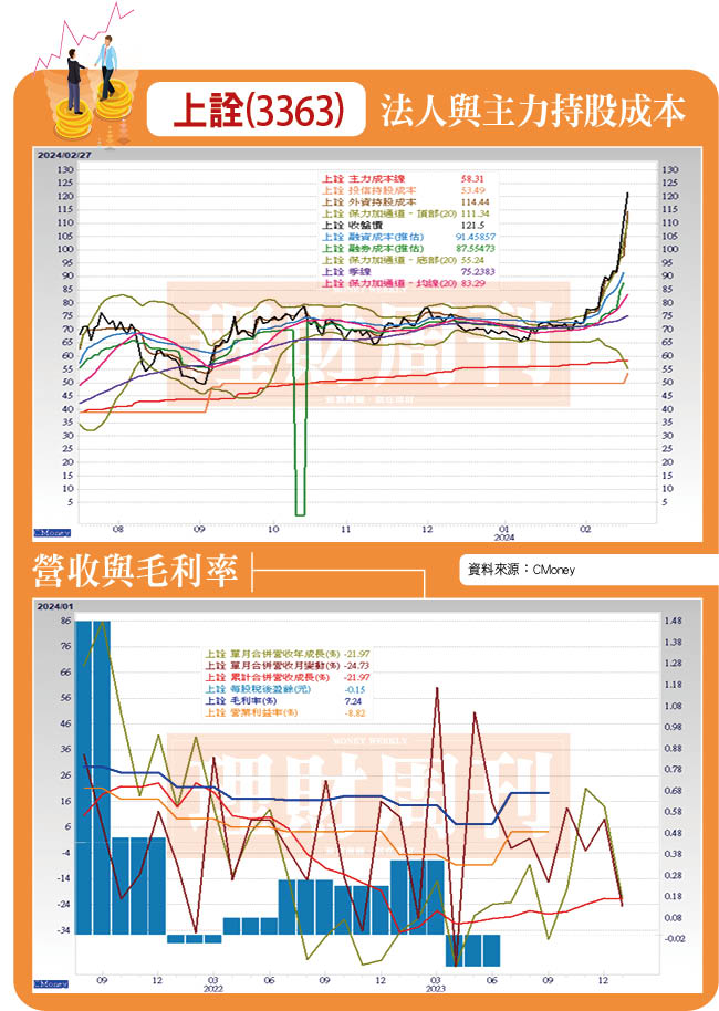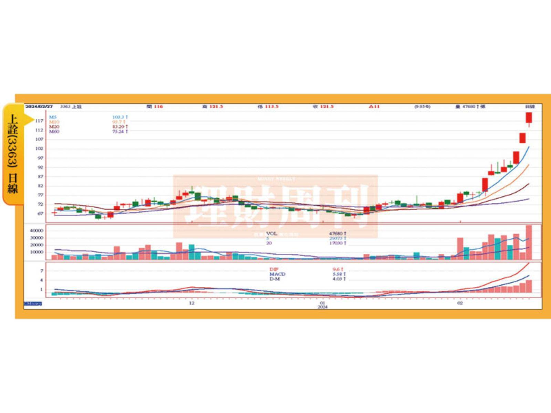 上詮股價打底四個月,今年二月初隨著AI題材起漲,外資二月買超4630張,股價沿五日均線上攻,價漲量增,多方氣勢強勁。