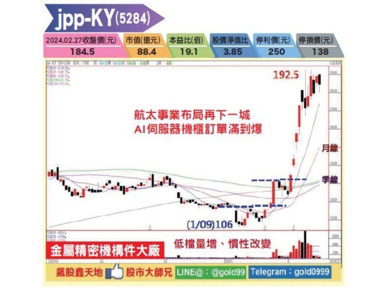 【個股推薦】jpp-KY(5284),經寶精密控股股份有限公司成立於1998年,是一家在泰國設廠的台資企業,為泰國前三大特殊金屬鈑金加工廠,以利基市場產品製造為主,提供客戶從產品設計至成品製造一站式服務及少量多樣客製化的解決方案,產品包括航電系統的機構件、4G&5G通訊櫃、網通設備、數位加值機、食品檢測儀、汽車散熱風扇及感應器、太陽能逆變器之機殼、伺服器、醫療用顯示器機構件、遊戲機、高速鐵路車輛零組件、工業印表機等。