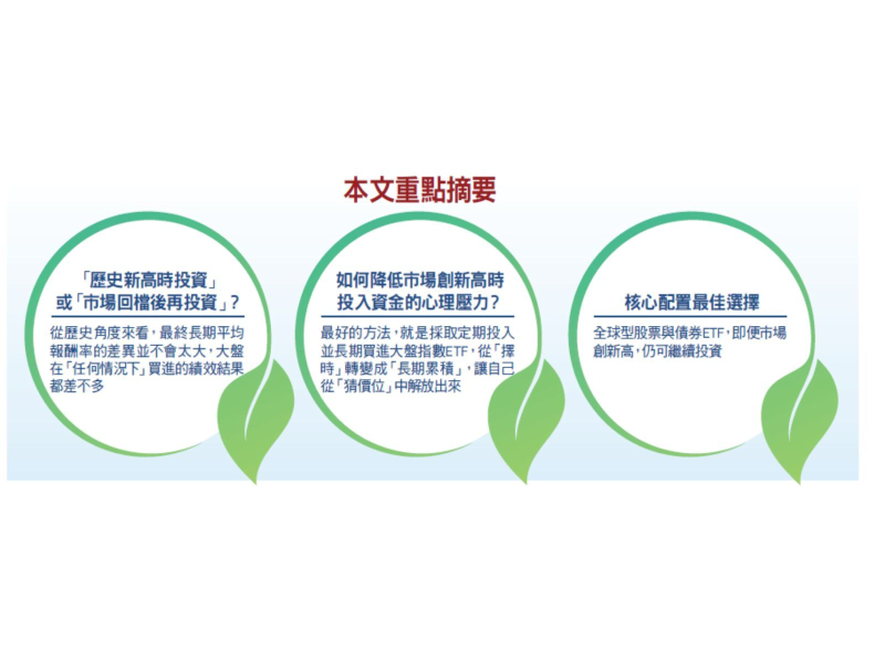 全球型股票與債券ETF是作為核心配置的最佳選擇。儘管市場創新高,依然能夠繼續投資。