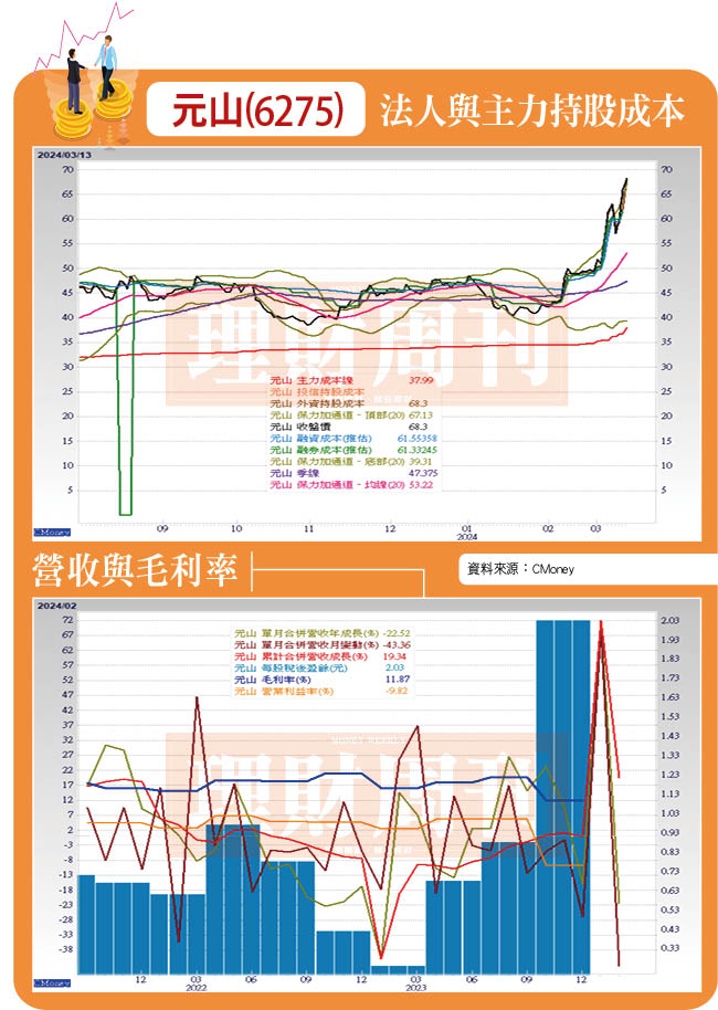 元山(6275)主攻散熱風扇,主要有汽車電子、高階IT及網通、生活系統等三大部門,比重分別為42%、34%、17%,去年受惠於汽車晶片緩解及中國車市回溫,全年營收36.3億元,年減0.15%,EPS4.08元,較2022年2.8元大幅成長37.9%。