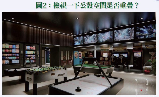 4.應注意「全區配置參考圖」等廣告是否將頂樓及管理委員會使用空間作為健身房、KTV、撞球室及烹飪教室等公共設施使用。