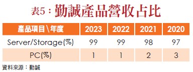 如表五, Server/Storage產品占比最大宗達97%以上,且逐年上升從2020年的97%提升到2023年99%。