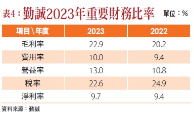 從表四可以看到,2023年相對於2022年各項重要財務比率,毛利率分別是22.9%優於20.2%,營業利益率13.0%優於10.8%,淨利率9.7%優於9.4%。