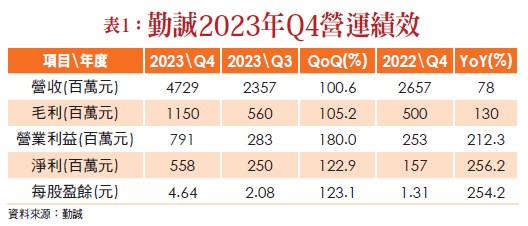 本刊在1224.1225期曾報導勤誠,本次聚焦在AI專案開發狀況、新廠區建置與設備構想、2023年第四季與全年營運成果。