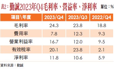 從表二可以看出毛利率、營業利益率、淨利率等,2023年第四季都表現優於第三季,且優於2022年同期;營業費用率、稅率都優(低)於第三季以及2022年同期。