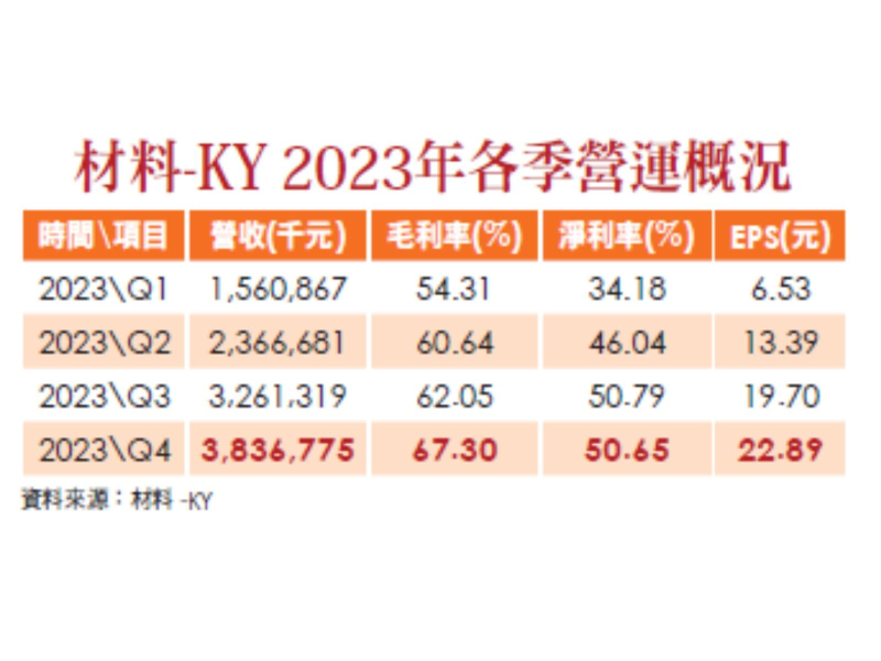 本刊前期(1222期)報導材料-KY曾預估第四季毛利率可望高於第三季,且EPS高於第三季,與近期公布的結果相符合。本期著重在2023年全年的營運成果、2024年營運策略、擴廠進度,以及材料-KY投資在女裝長絲的市場概況。