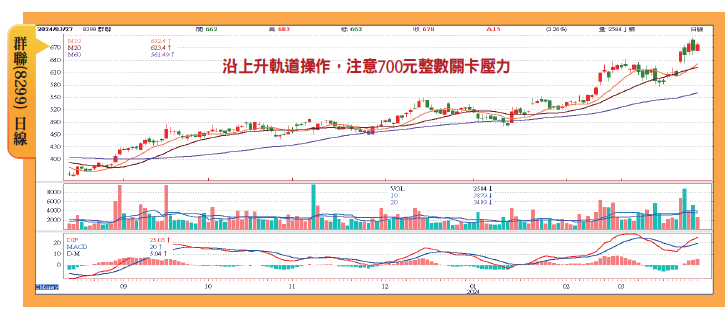 理周投研部表示,群聯受惠車用NAND銷售高速成長,市場預估第一季毛利率仍有高達37%水準,紛調高今明兩年每股稅後淨利(EPS)至42元與60元,以平均EPS51元,給予15倍本益比計,中長線目標價780元,短線以700元為攻頂壓力區。