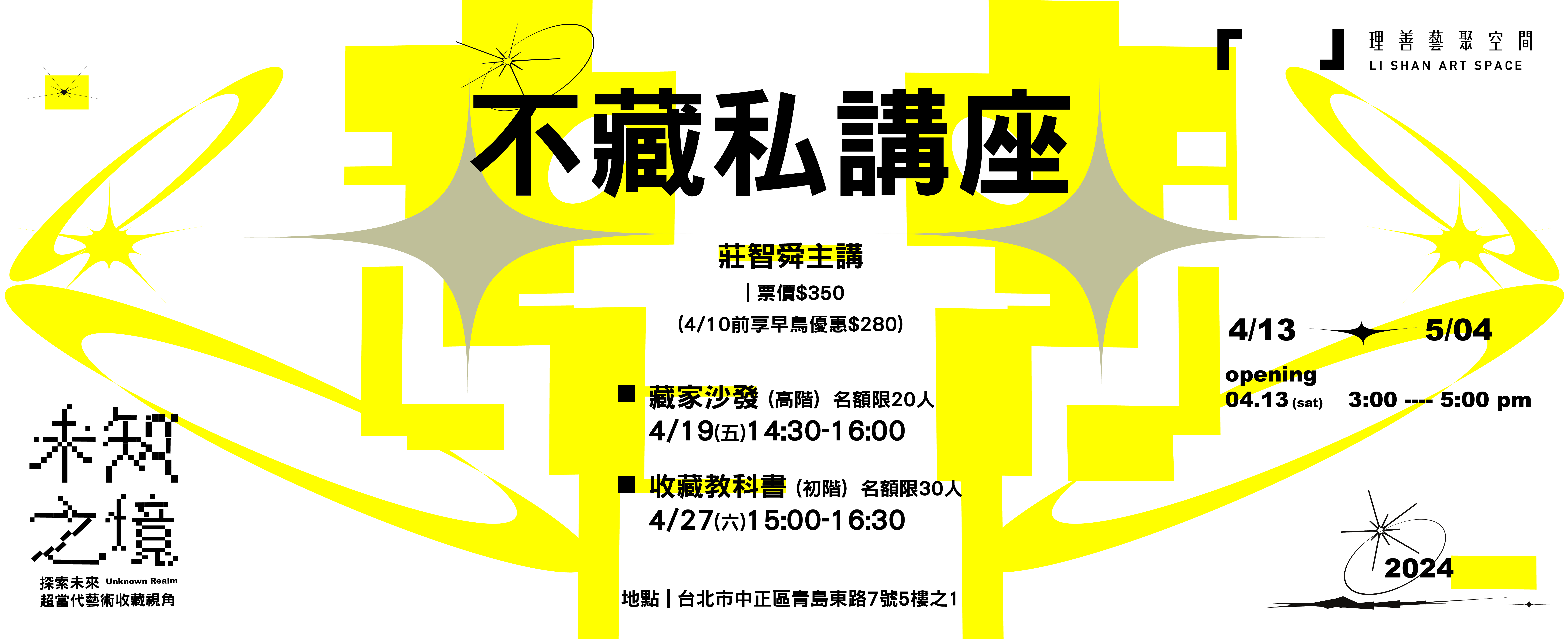 本檔展覽,特別舉辦兩場【不藏私講座】:第一場為4/19(五)藏家沙發,讓資深收藏家們可以相互交流藝術收藏與投資經驗;第二場4/27(六)收藏教科書,從實務面向方面聊如何進入藝術市場,提供新手小白學習和了解更多藝術投資的方向和策略,以及如何成為收藏家有脈絡作系統性的藝術品收藏,從收藏家莊智舜的觀點切入和大家分享想法與親身經驗,共同探索藝術收藏的無限可能性。