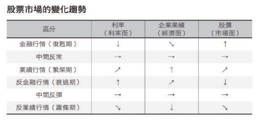 經濟有「恢復期→活躍期→衰退期→停滯期」四個階段。股市行情一般也分為四個階段,首先是金融行情,以貨幣寬鬆為背景,雖然經濟仍不景氣但股價上漲時期。從那時起,牛市就即將展開。此後,如果看見景氣復甦變得明顯,業績行情就會開展。當經濟過熱和通貨膨脹接近巔峰時,貨幣緊縮的政策就會開始,此時股價會大幅下跌,就是反金融行情。接著,因景氣衰退,企業業績轉為負成長,股市行情就將進入低谷的反業績行情。景氣循環和股市行情四個方面幾乎一致,但是一般情況下股市變動會先於景氣變化。
