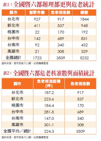 住商機構彙整都市更新網數據,全台截至2月底,已有3509件危老案經過核准,而都更件數也達1723件,其中都更、危老申請均以北市核准的917件為最多,值得一提的是,台中市危老申請量超越新北,位居第二,顯示全台進入「大重建時代」(表一、表二)。