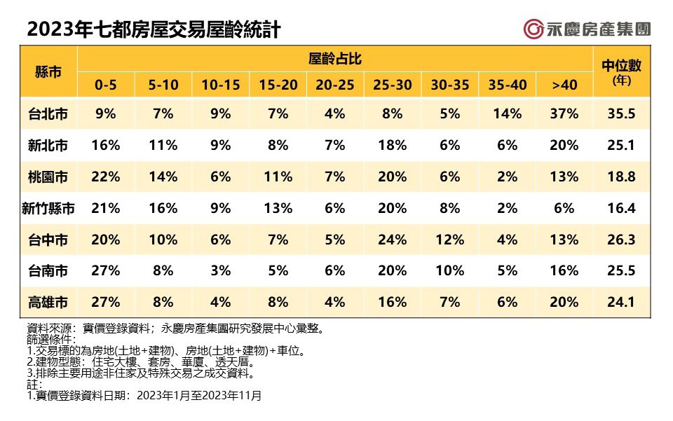 永慶房屋研展中心副理陳金萍指出,台北市是七都之中都市化程度最高的縣市,歷經長期發展,時至今日可供建築的大面積土地稀少,近年新建案多是採取都更、危老等方式辦理,但新增供給有限,因此屋齡三十年以上建物比例居高不下,消費者購屋時可選擇的房子屋齡也偏高,2023年交易案件中屋齡四十年以上占比高達37%,直逼四成。