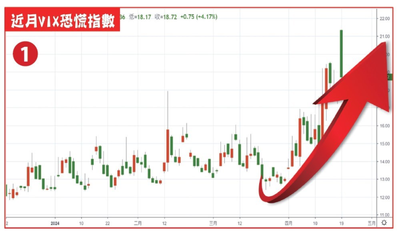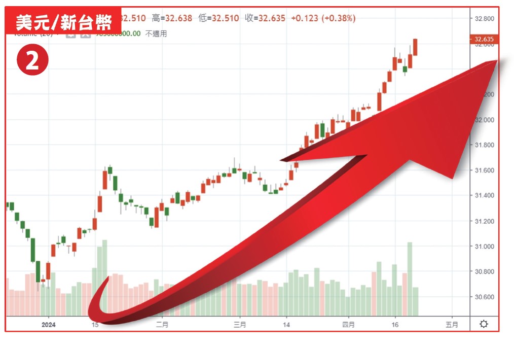 國際地緣政治風險升溫(伊朗vs.以色列),金融市場草木皆兵恐慌情緒再起,恐慌指數VIX衝高至21.36(如圖一),紐約布蘭特原油衝高至每桶92.18美元,避險資金流入美元,美元指數上攻106.5,美元兌新台幣由年初30.735近期加速貶至4/22的32.66,貶幅高達6.3%(如圖二),外資一至三月買超台股1,372億元,而4/1~4/22就賣超2,133億元,將前三個月的買超全吐回去。