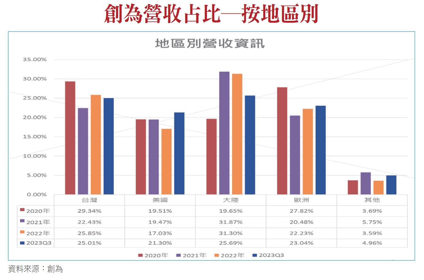 以台灣地區營收占比最高,近三年來維持在22%以上。其次,中國地區維持在25%到30%;中國地區則是營收成長較高的地區。