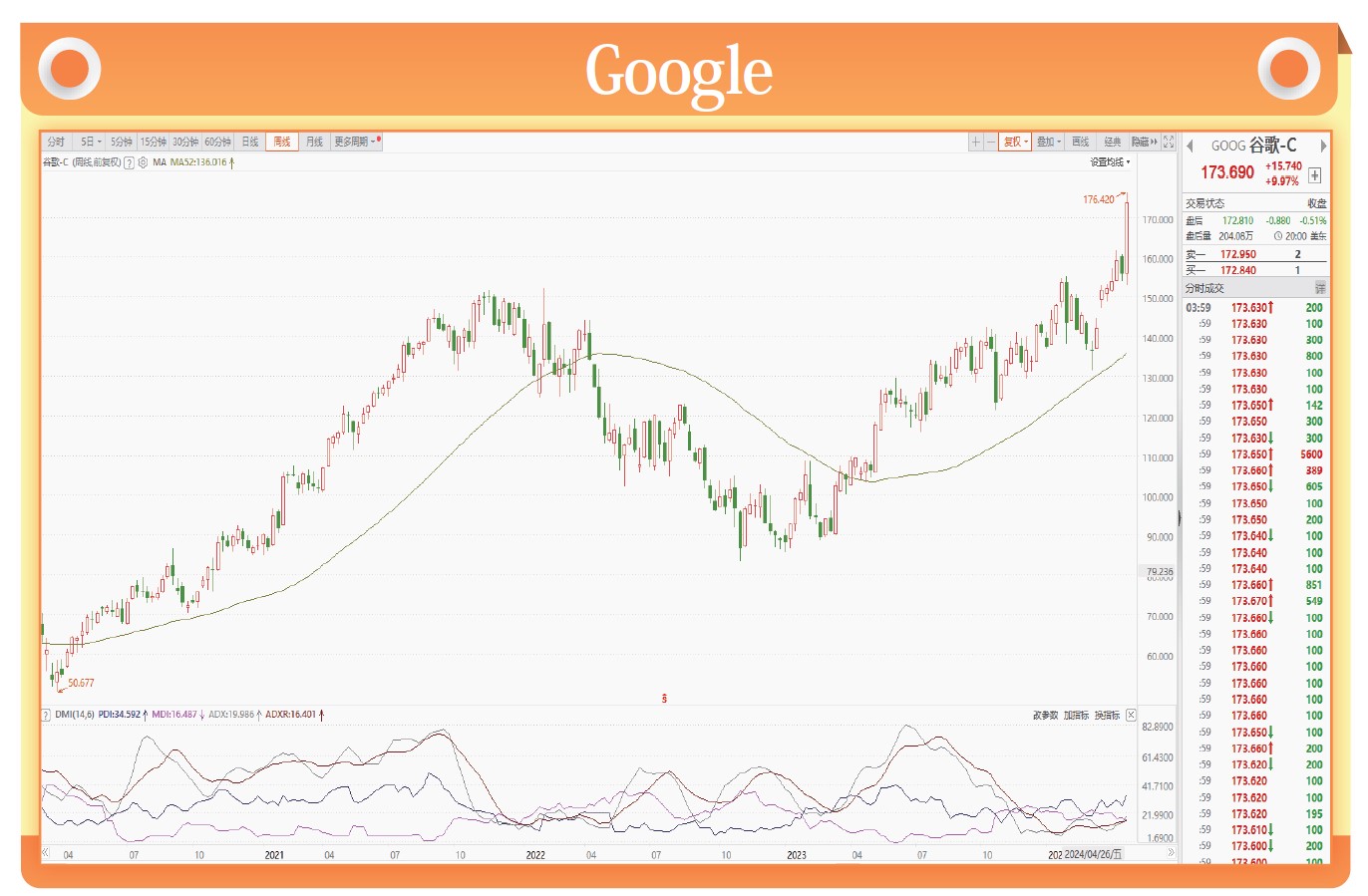 另一個AI巨人的谷歌,母公司Alphabet因雲端計算成長,獲利成長57%,同時宣布發放每股二十美分股利,並且計畫未來每季都發放現金股利,另外要回購七百億美元股票,4月26日收盤大漲+9.97%。