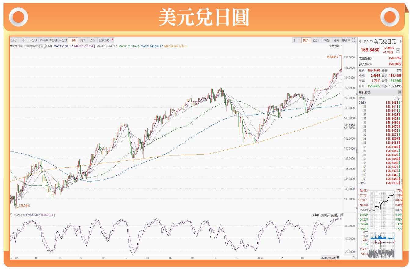 日圓的崩跌走勢,已經透露聯準會想降息卻又不得不抗通膨的兩難,既然不能升息,那就讓非美貨幣貶值來變相支撐美元的相對強勢,從這個角度來推測五月的FOMC會議,不排除會後聲明鴿派偏鷹,這點或許日本央行4月26日暗示將保持貨幣寬鬆的決議已經替聯準會做了鴿派偏鷹的背書。