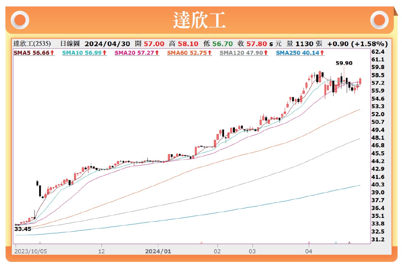 達欣工長期為台積電的建廠夥伴,達欣工也參與房地產建案開發,目前在手案量達到350億元以上,維持近幾年營收超過二至三倍的水準,處歷史高峰,達欣工主要承攬的商辦大樓以北士科金仁寶集團總部的案量最大。