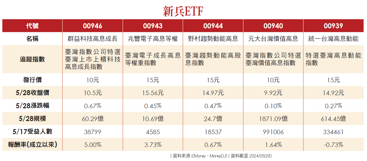 隨著台股大盤加權指數不斷創歷史新高,今年來高息ETF也持續在發燒,盤點新成立的5檔新兵,包括「群益科技高息成長(00946)」、「兆豐電子高息等權(00943)」、「野村趨勢動能高息(00944)」、「元大台灣價值高息(00940)」、「統一台灣高息動能(00939)」,都是以主打月配息的方式,以「高股息」來吸引投資人潮,本次特別企畫就幫讀者整理這五檔新兵的近期表現及特色介紹!