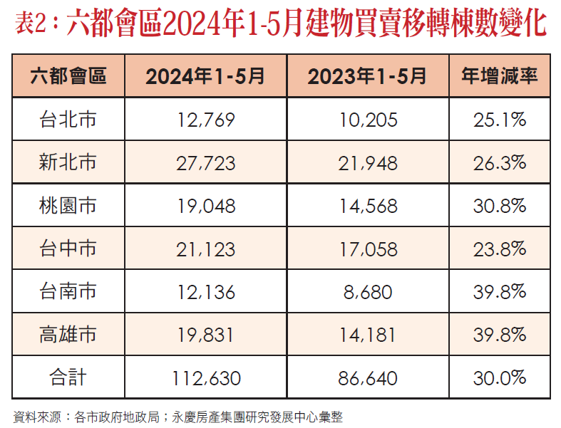 永慶房屋研展中心副理陳金萍指出,今年一至五月六大都會區建物買賣移轉棟數表現,六都整體交易量合計為112,630棟,與去年同期相比年增30.0%(表二),創下自2012年以來,十三年來第二高紀錄,僅次於2013年,房市買氣火熱。