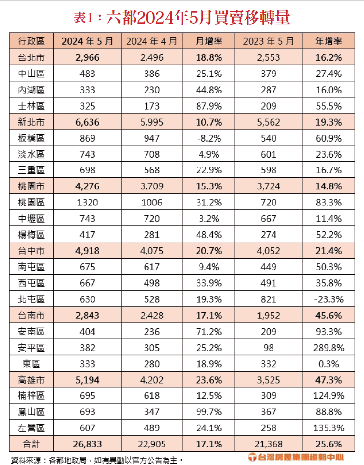 台灣房屋集團表示,六都已公布今年五月的買賣移轉棟數,分別為台北2966棟,月增18.8%,年增16.2%;新北6636棟,月增10.7%,年增19.3%;桃園4276棟,月增15.3%,年增14.8%;台中4918棟,月增20.7%,年增21.4%;台南2843棟,月增17.1%,年增45.6%;高雄5194棟,月增23.6%,年增47.3%。總計六都五月買賣移轉量達26833棟,月增17.1%,年增25.6%,締造近十一年來的五月同期新高(表一)!