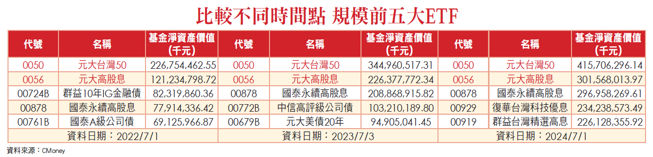 台股(原型)ETF規模持續上漲,市場統計至6月27日,已經突破2.25兆元,可見ETF市場有多熱。觀察近幾年ETF市場,有大者恆大的趨勢,資金多集中在規模前幾大的ETF,舉例來說,從2024年7月1日、2023年7月3日、2022年7月1日比較,以基金淨資產價值的前五名來看,元大台灣50 (0050)、元大高股息(0056)與國泰永續高股息(00878)都位於前五名,尤其以0050與0056在這三個時間點都在前兩名,且每年幾乎增長千億的規模。