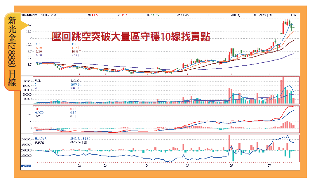 新光金轉骨有成,七月以來外資買超11.4萬張,上周股價突破新高來到11.45元,理周投研部預估,新光金上半年賺1.3元,給10倍本益比,目標價13元。若以下半年獲利同上半年來預估,全年獲利2元到2.6元,以10倍本益比,新光金至少有20元的實力。