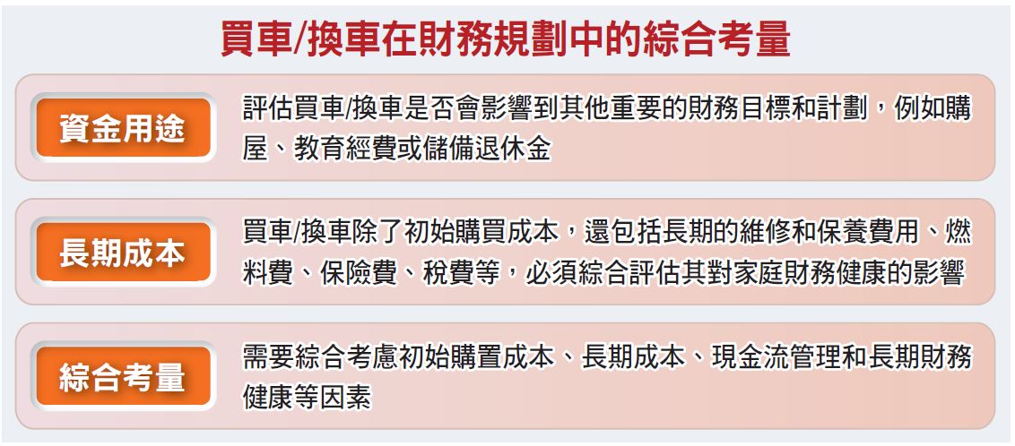 買車所花費的資金可以用於其他投資或儲蓄計劃,例如房屋、教育或退休金。需評估買車是否會影響到其他重要的財務目標和計劃。