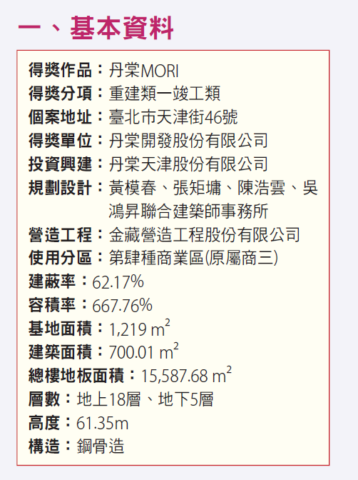 「丹棠MORI」位於「五條通」,為日據時期大正町之中心,也為當時的高級住宅社區,後發展為條通商圈之核心,因經過60年的都市發展,顯得雍塞窳陋。「丹棠MORI」在規劃上,重視反映中山北路林蔭道之時尚與靜謐、華山藝文特區與當代美術館之人文藝術,也不忘延續繁華的條通商圈,最終融合歷史與現代,於1到4樓規劃商業使用,以串連現有地面層之商業街區,延續既有人行及條通商圈紋理,而5樓以上規劃住宅,並採逐層退縮設計,讓住宅部分可遠離熱鬧的商業街面,維持住宅的寧適,故本案不只更新再造老舊社區,更期能帶動條通文化,重現當地之歷史與人文風采。