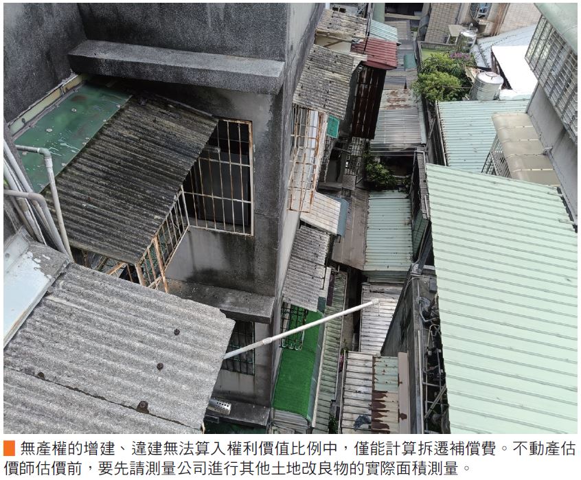 特別需要注意的是,無產權的建物面積、增建部分就無法算入權利價值比例中,僅能計算拆遷補償費。